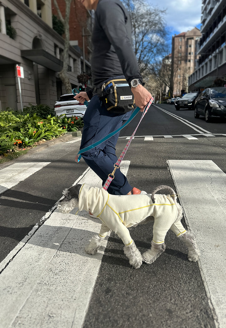 A convenient opening allows easy attachment of a leash to a collar or harness.