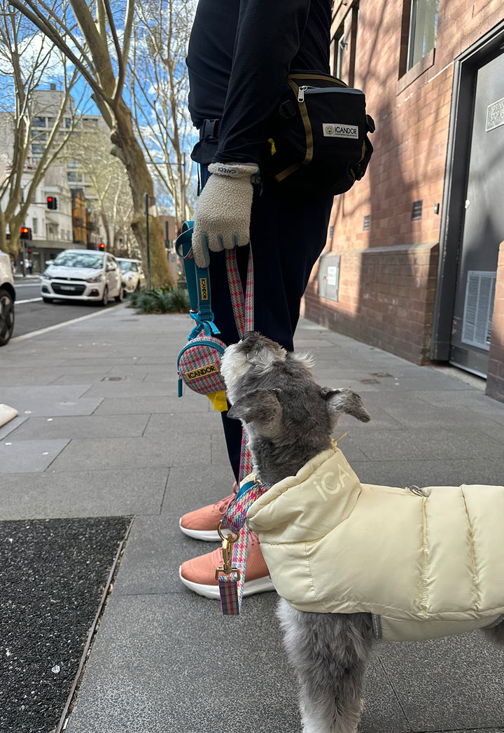犬のハーネスとシームレスに互換性があるように設計された YKK ジッパー開口部にリードを取り付けます。